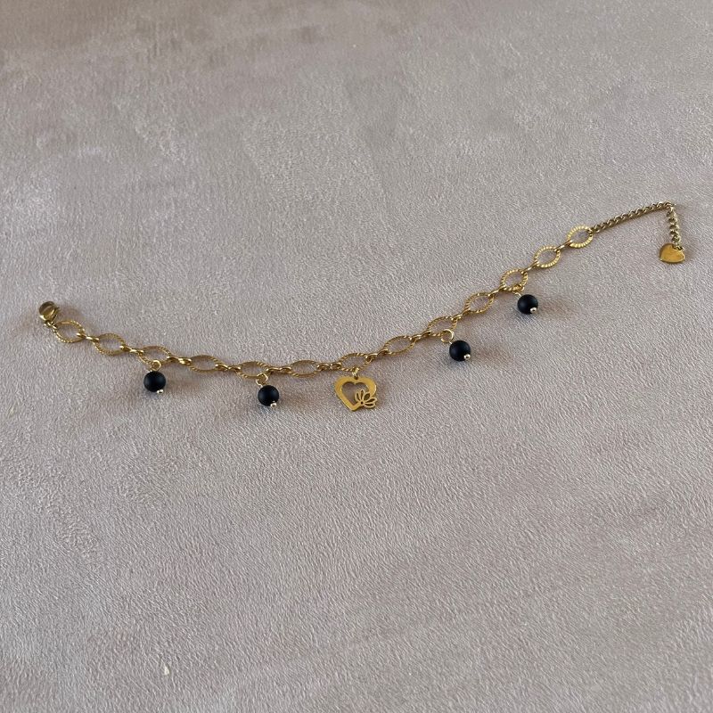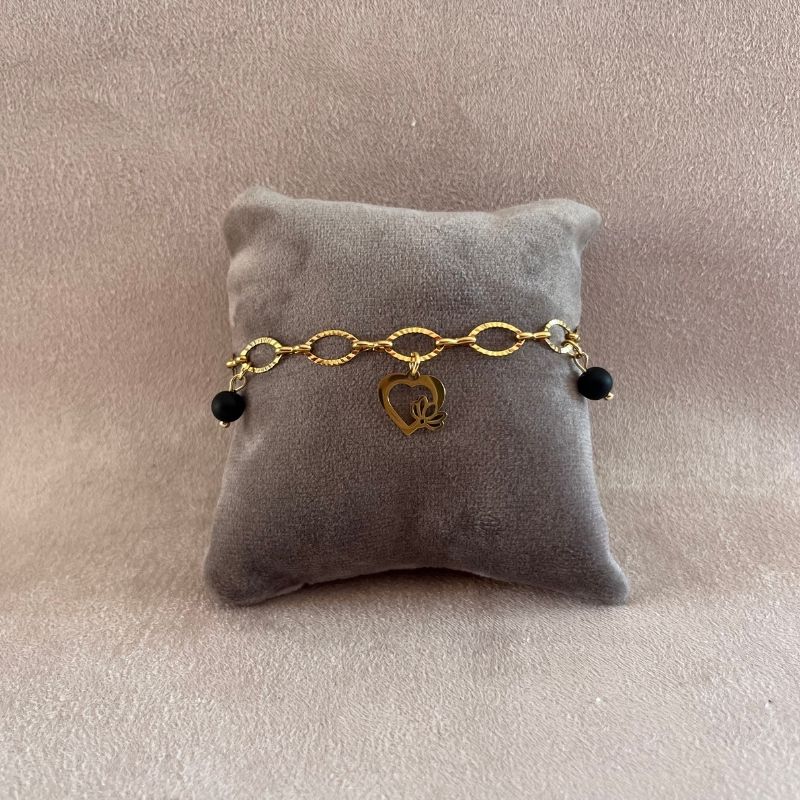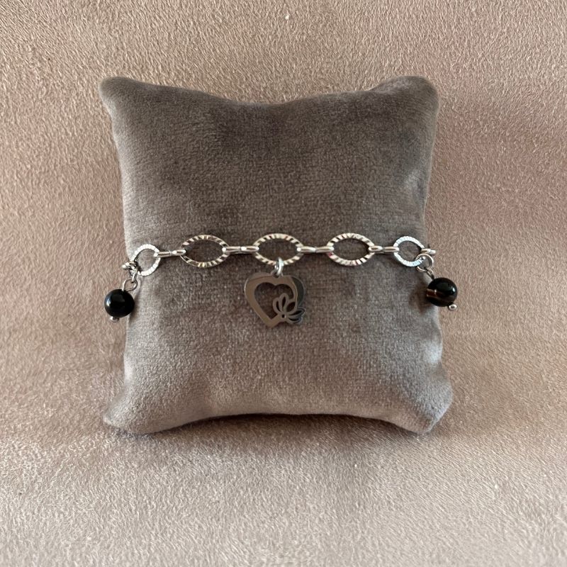 Délicat et lumineux, le bracelet Oréline marie perles en pierres naturelles onyx noire et coeur en acier inoxydale pour une élégance intemporelle.
