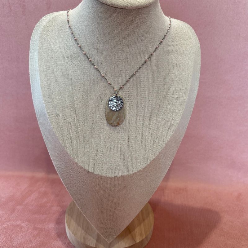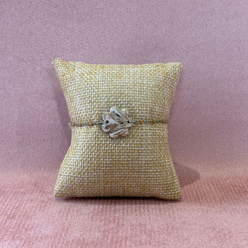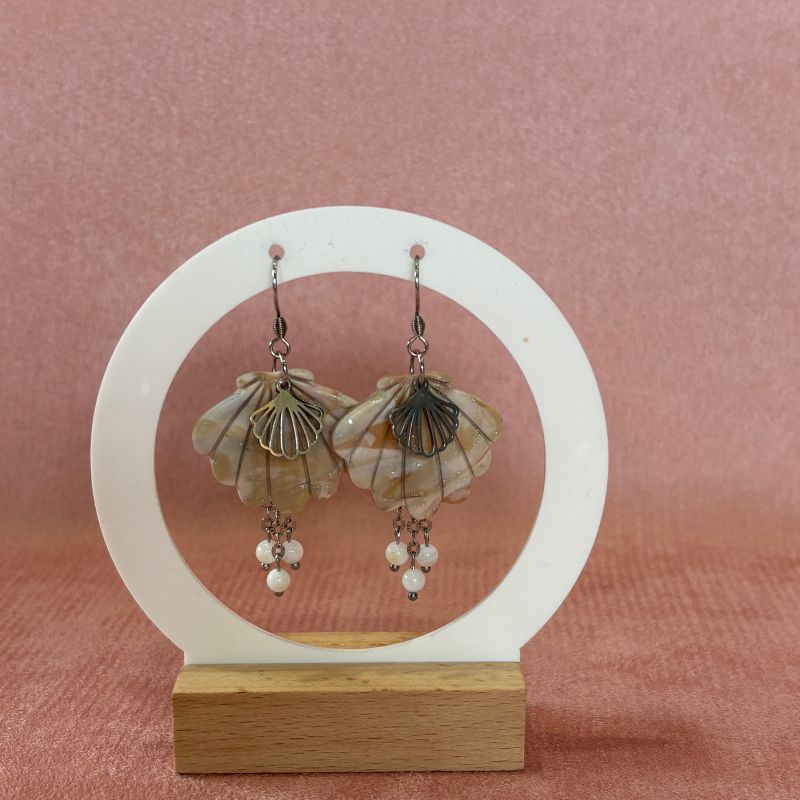 Chaque bijou mêle la délicatesse de l’argenté à des touches rosées rappelant les coquillages.